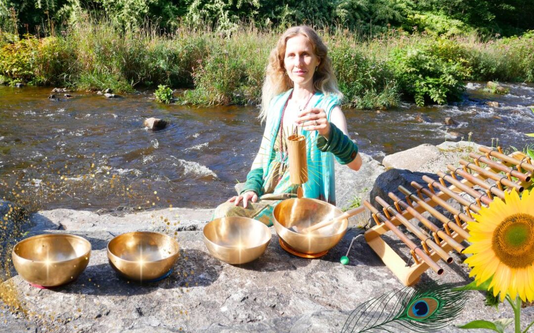 Frau sitzt am Bach mit Klangschalen, Koshi und Klangspiel